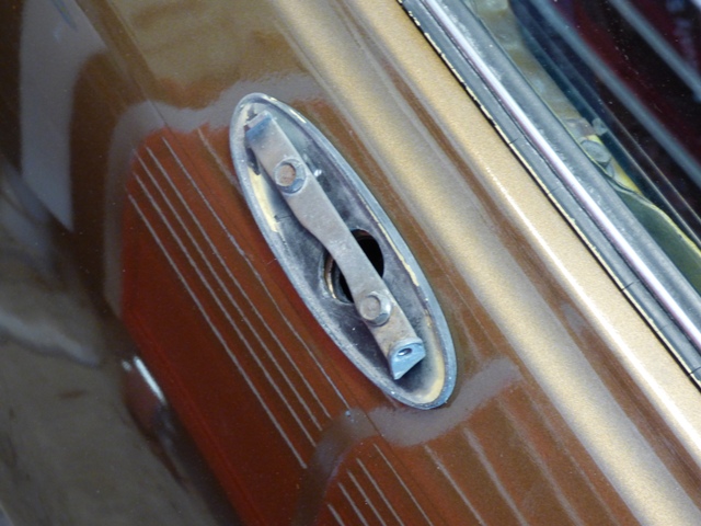Driver's side lock installed correctly. The painter put it in... wrong. He swapped sides and jammed it in with some goo. I pulled both out, cleaned them, and then put the proper retaining clip on to hold it in place. Only had one clip in the bag, good thing I have 2 parts cars worth of bolts and brackets on the shelf nearby.