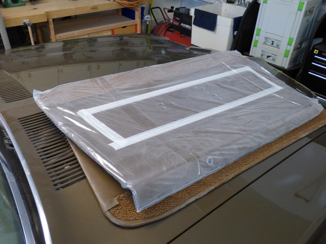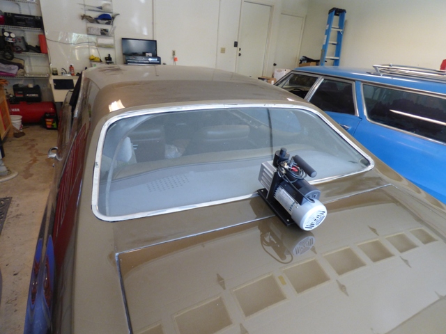 Rear window trim has been straightened out and banged as best into place as possible. The vacuum pump's rubber feet and bending the back 2 pieces to keep them from popping up. That's what happens when you bend the heck out of the trim trying to remove it...