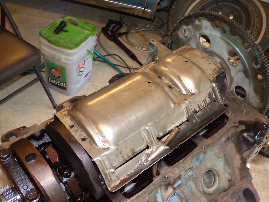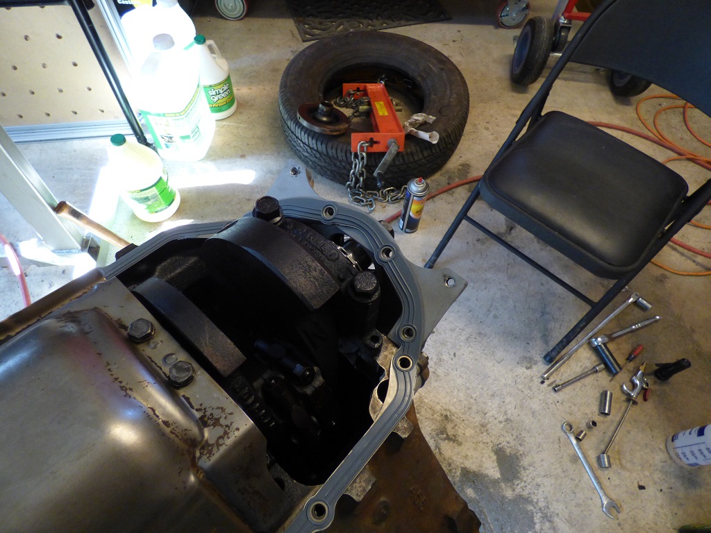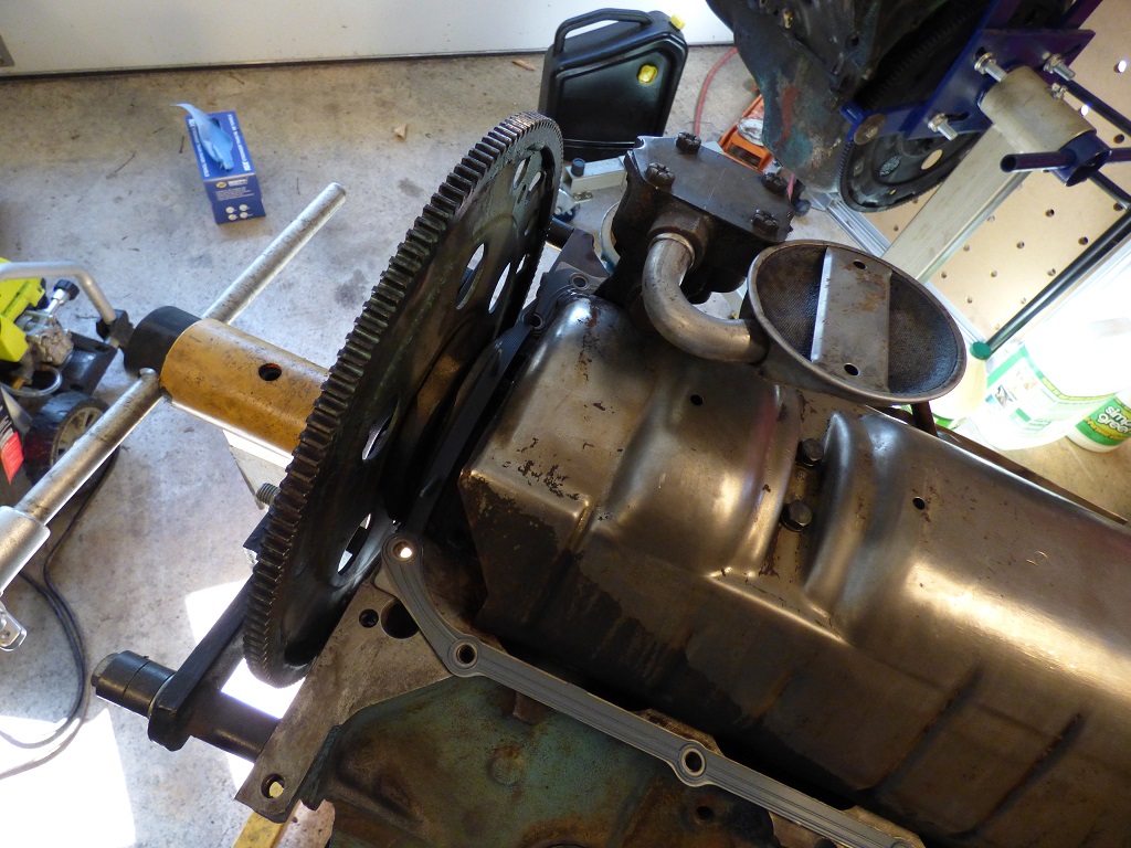 Oil pan goes on. A little massaging is needed to get all the bolts to line up as it is a complicated piece, but no major issues.