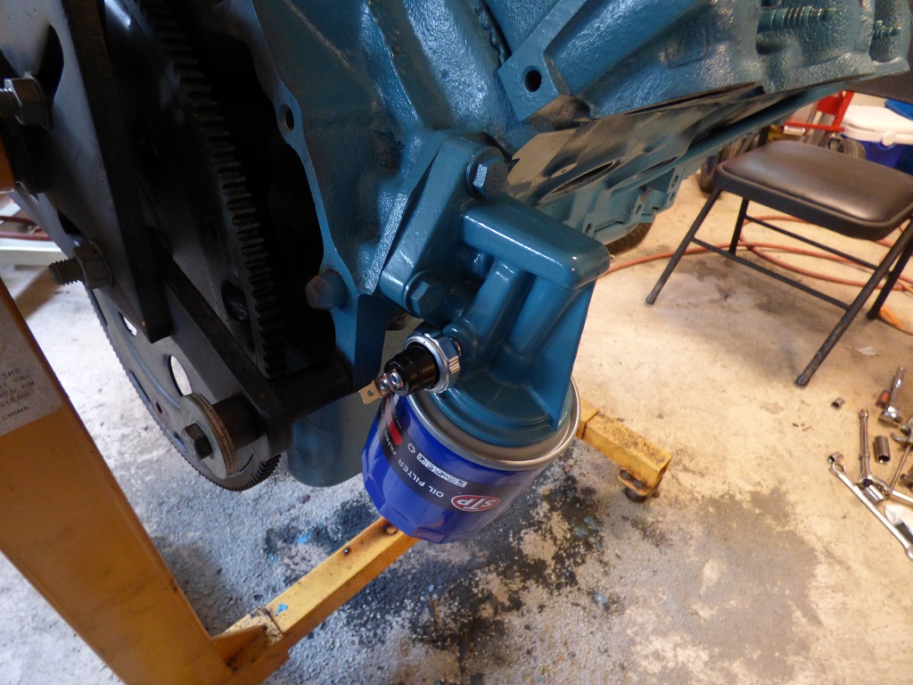 Oil filter housing with new filter and new sending unit. Looks pretty nice! Hopefully it won't leak...