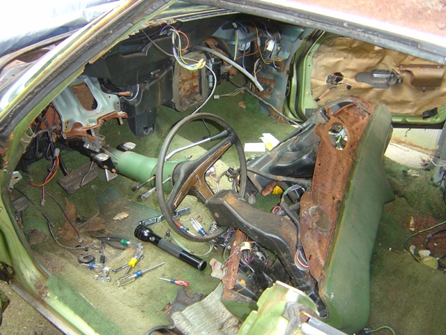 Almost everything of value out of the interior. The A-pillars are rotten too, so cowl, roof, and window channels are all bad on this car. Such a shame.