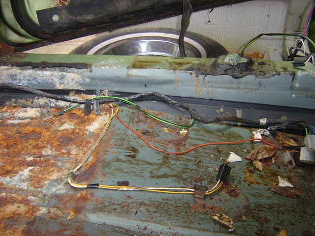 Rear body harness comes through here along with trunk release (black wire) and rear window defroster (purple wire). Two separate options that required extra harness running. The extra black wire running wild is the former owner's CB antenna.